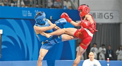 越南隊(duì)運(yùn)動(dòng)員(右)在武術(shù)散打男子56公斤決賽中。