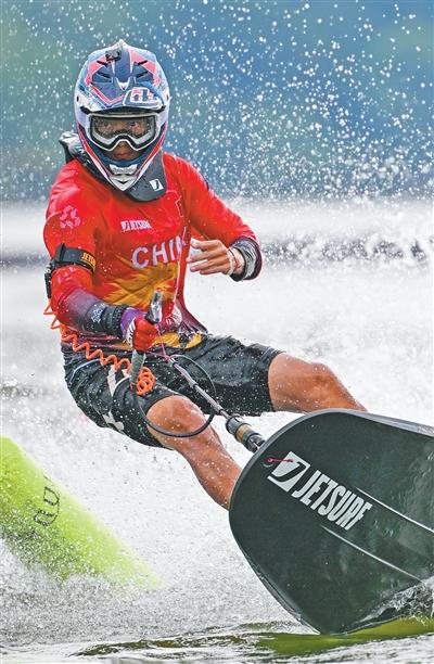 中國(guó)隊(duì)運(yùn)動(dòng)員張茂竹在摩托艇男子動(dòng)力沖浪板決賽中。