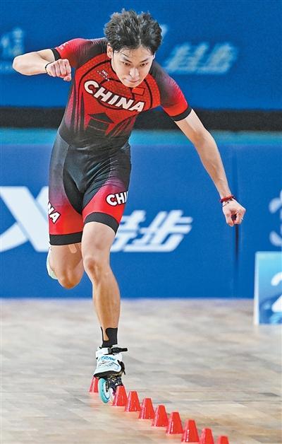 中國(guó)隊(duì)運(yùn)動(dòng)員付裕在自由式輪滑男子速度過(guò)樁決賽中。