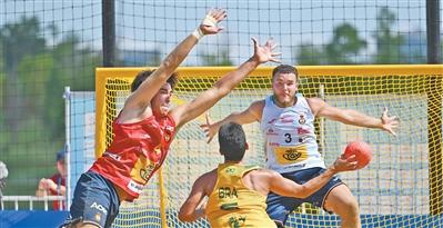 西班牙隊(duì)守門(mén)員(右)和隊(duì)友(左)在沙灘手球男子銅牌賽中。
