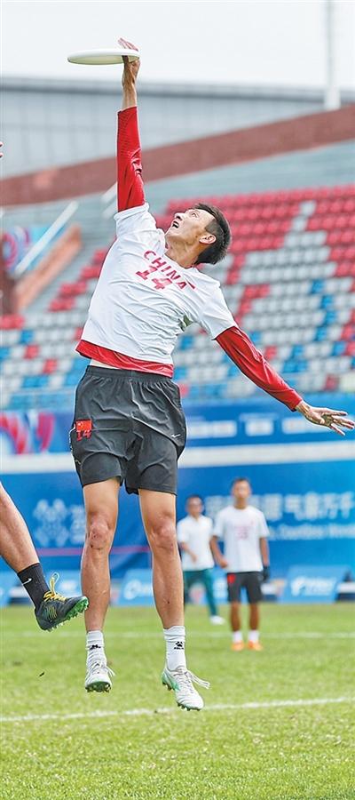 中國(guó)隊(duì)運(yùn)動(dòng)員在團(tuán)隊(duì)飛盤(pán)比賽中。
