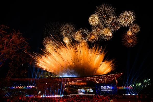 8月17日,第12屆世界運(yùn)動會閉幕式在成都舉行。圖為閉幕式現(xiàn)場焰火表演。新華社記者 貝赫/攝