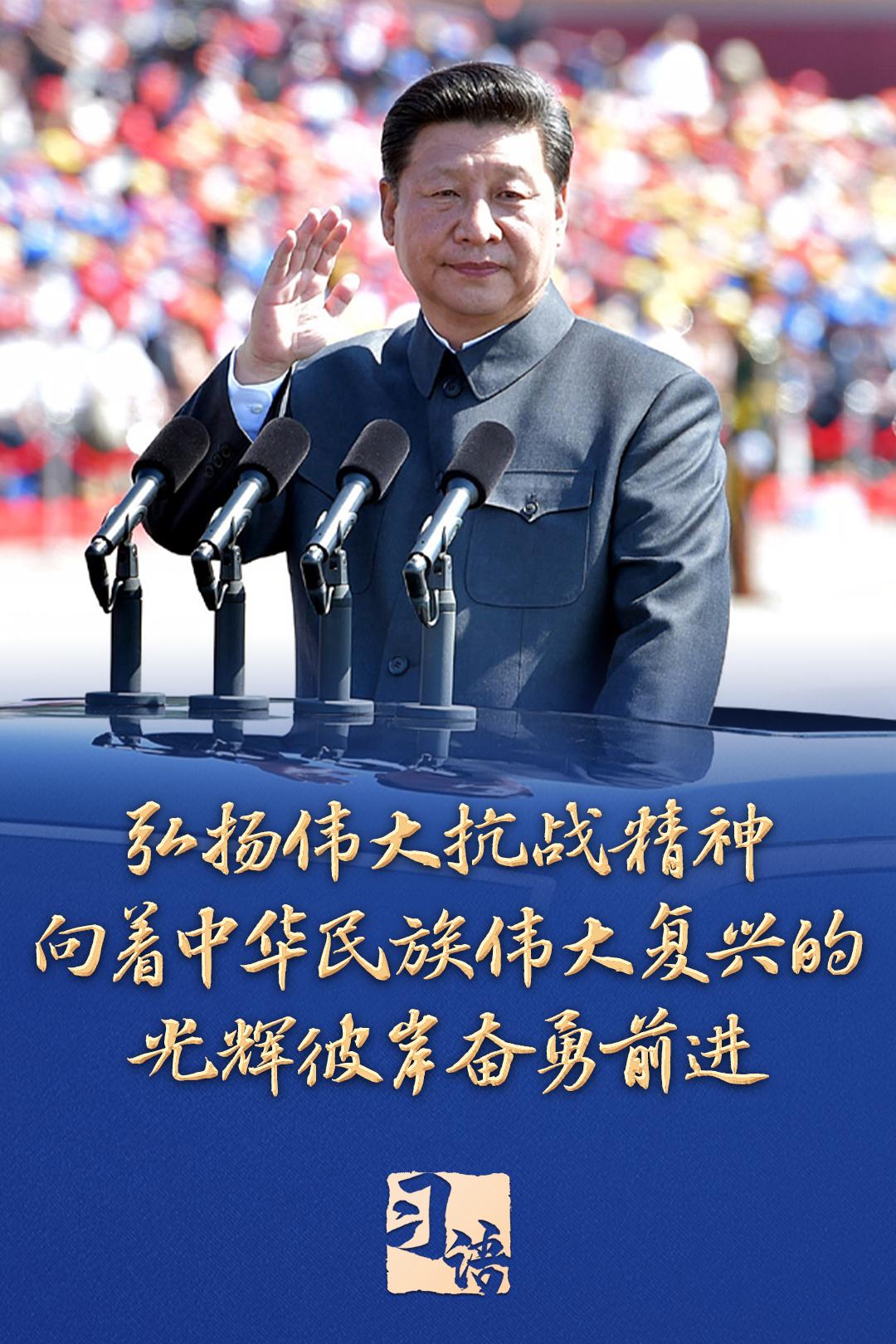 “新的歷史條件下,全黨全國(guó)各族人民要大力弘揚(yáng)偉大抗戰(zhàn)精神,不斷增強(qiáng)團(tuán)結(jié)一心的精神紐帶、自強(qiáng)不息的精神動(dòng)力,繼續(xù)朝著中華民族偉大復(fù)興的中國(guó)夢(mèng)奮勇前進(jìn),不斷以堅(jiān)持和發(fā)展中國(guó)特色社會(huì)主義的新成就告慰我們的前輩和英烈!”