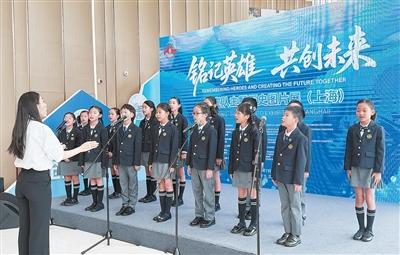 7月8日,上海宋慶齡學(xué)校學(xué)生合唱團(tuán)在“銘記英雄 共創(chuàng)未來(lái)”飛虎隊(duì)主題歷史圖片展開(kāi)幕式上演唱歌曲《友誼地久天長(zhǎng)》。