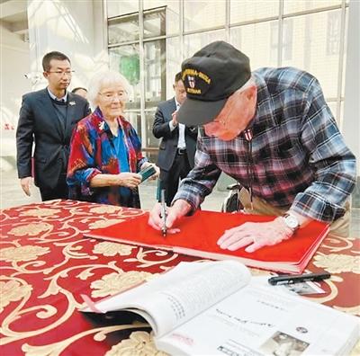 飛虎隊(duì)老兵麥克馬倫(右一)參觀昆明飛虎隊(duì)紀(jì)念館后寫(xiě)下留言:“時(shí)隔80年來(lái)到昆明,看到現(xiàn)代昆明的巨大變化,真是太棒了。”