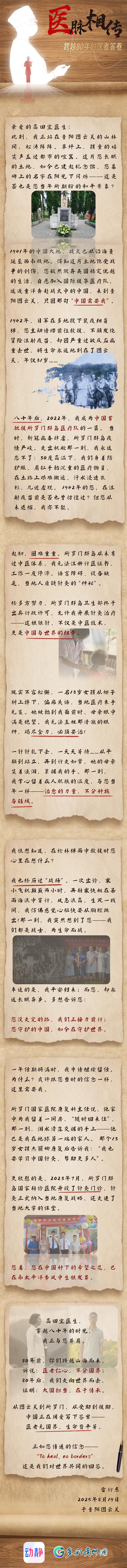 1941年,貴陽(yáng)圖云關(guān)——英國(guó)女醫(yī)生高田宜來(lái)到當(dāng)時(shí)中國(guó)抗戰(zhàn)救援的“心臟”,將畢生醫(yī)術(shù)投向這片飽受創(chuàng)傷的土地。2022年,所羅門(mén)群島——由貴州承派的中國(guó)首批援所醫(yī)療隊(duì)抵達(dá),貴州醫(yī)生雷衍東將中醫(yī)技術(shù)“種”在了地球的另一端,讓這片土地長(zhǎng)出治愈的力量。80年,醫(yī)脈相傳。從圖云關(guān)到所羅門(mén),從受助到援助,中國(guó)正在用愛(ài)寫(xiě)下答案——醫(yī)者仁心,不分國(guó)界。大國(guó)擔(dān)當(dāng),在于傳承。 (點(diǎn)擊查看視頻) 謹(jǐn)以此片 紀(jì)念中國(guó)人民抗日戰(zhàn)爭(zhēng) 暨世界反法西斯戰(zhàn)爭(zhēng)勝利80周年 并向所有為人類健康事業(yè)奉獻(xiàn)的 醫(yī)務(wù)工作者致敬 |