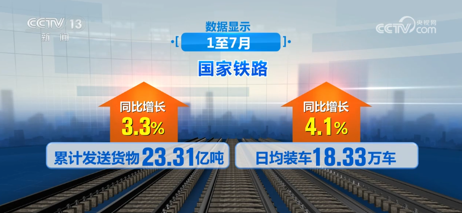 數(shù)據(jù)顯示,1至7月,國家鐵路累計(jì)發(fā)送貨物23.31億噸、日均裝車18.33萬車,同比分別增長3.3%、4.1%。