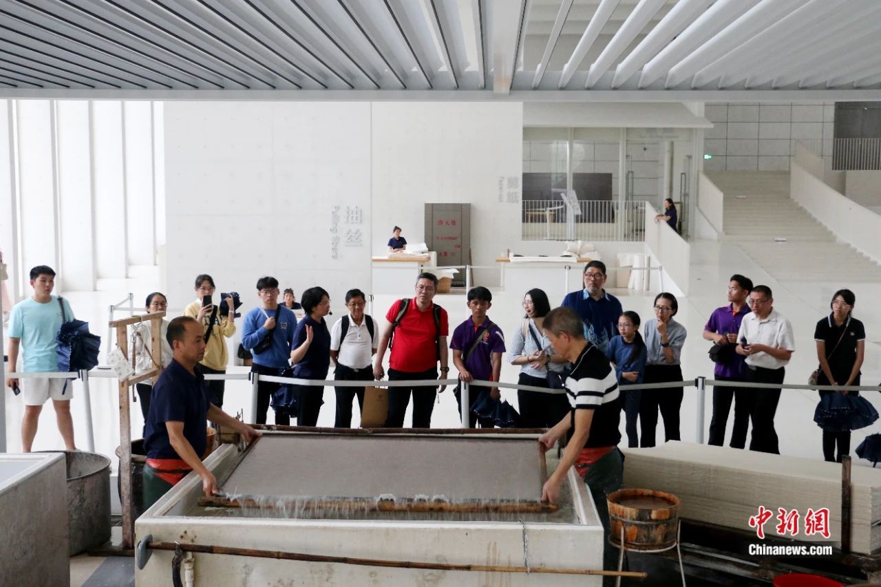 馬來(lái)西亞游客在中國(guó)宣紙小鎮(zhèn)參觀(guān)宣紙撈紙技藝。張強(qiáng) 攝