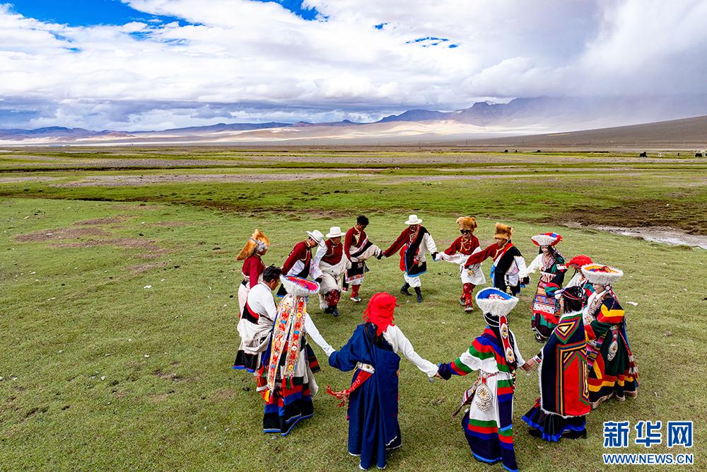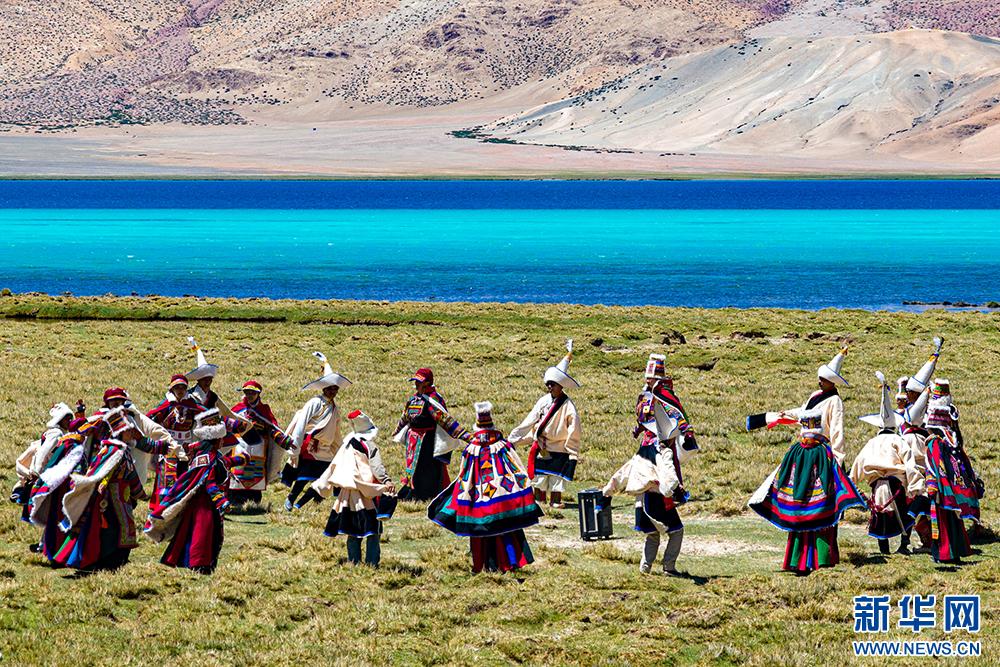 身穿自治區(qū)級非物質(zhì)文化遺產(chǎn)“森郭服飾”的改則縣群眾在湖畔跳鍋莊(6月21日攝)?!吧棥北蛔u(yù)為“五彩彩虹服”,主要由紅、綠、黑、黃、藍(lán)五種顏色的氆氌制成。新華網(wǎng) 旦增努布 攝