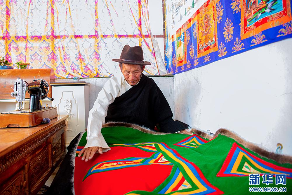 “噶爾傳統(tǒng)服飾”地區(qū)級代表性傳承人石達(dá)次仁在介紹自治區(qū)級非物質(zhì)文化遺產(chǎn)“噶爾傳統(tǒng)服飾”(6月14日攝)?!案翣杺鹘y(tǒng)服飾”由羊羔皮和呢子內(nèi)外兩面縫制而成,形狀為正方形,制作簡易,內(nèi)里均為純白色的羊羔皮,羊羔皮既保暖又有裝飾性。新華網(wǎng) 旦增努布 攝
