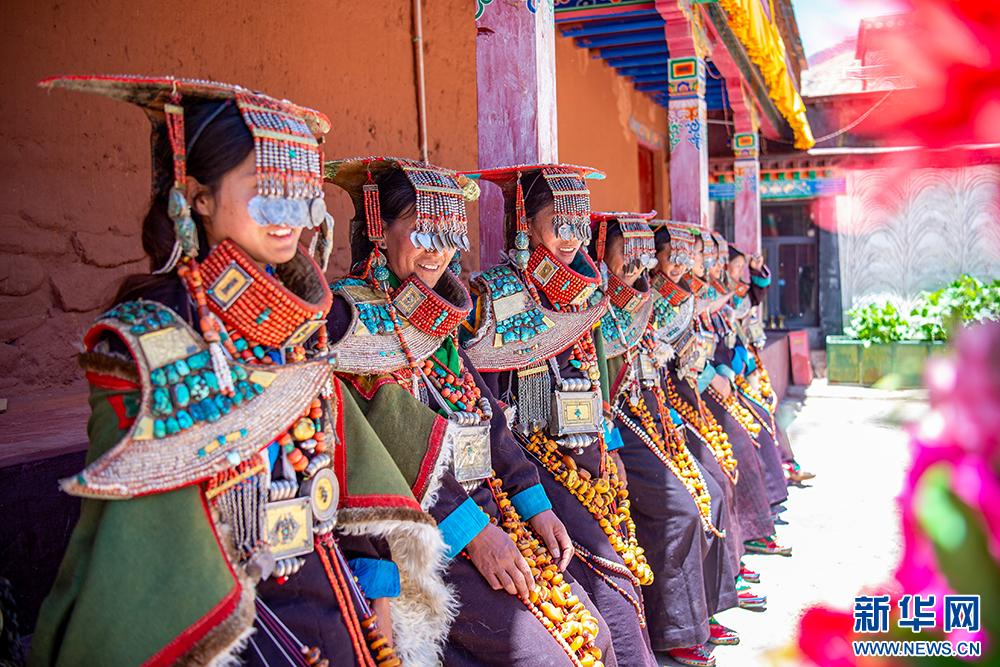 身著“普蘭服飾”的普蘭縣科迦村村民(6月10日攝)?!捌仗m服飾”,主要由袍子、披風(fēng)、頭飾、項(xiàng)鏈、腰帶、耳墜、靴子組成。其中最精美、最獨(dú)特的為婦女服飾,外形設(shè)計(jì)如同孔雀開屏,被譽(yù)為“孔雀”服飾,一套重達(dá)20多公斤,裝飾有黃金、白銀、蜜蠟、珊瑚、綠松石等。新華網(wǎng) 旦增努布 攝