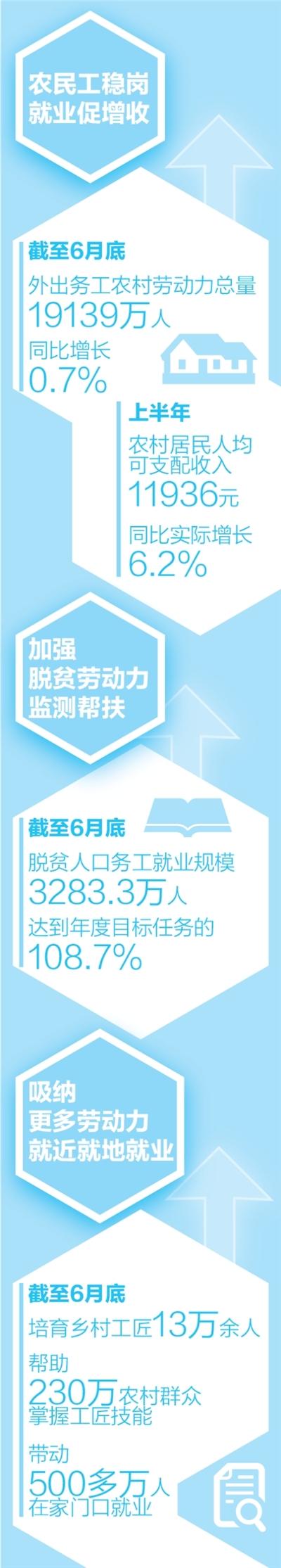 今年受內(nèi)外部經(jīng)濟(jì)形勢影響,農(nóng)民工就業(yè)增收面臨不少困難挑戰(zhàn)。廣大企業(yè)頂住壓力積極作為,闖市場穩(wěn)訂單,吸納更多就業(yè);各地區(qū)各部門千方百計(jì)拓寬就業(yè)渠道,提升農(nóng)民工技能水平。二季度末,外出務(wù)工農(nóng)村勞動(dòng)力達(dá)1.91億人,同比增長0.7%;上半年,農(nóng)村居民人均可支配收入11936元,扣除價(jià)格因素實(shí)際增長6.2%,高于城鎮(zhèn)居民收入增速。