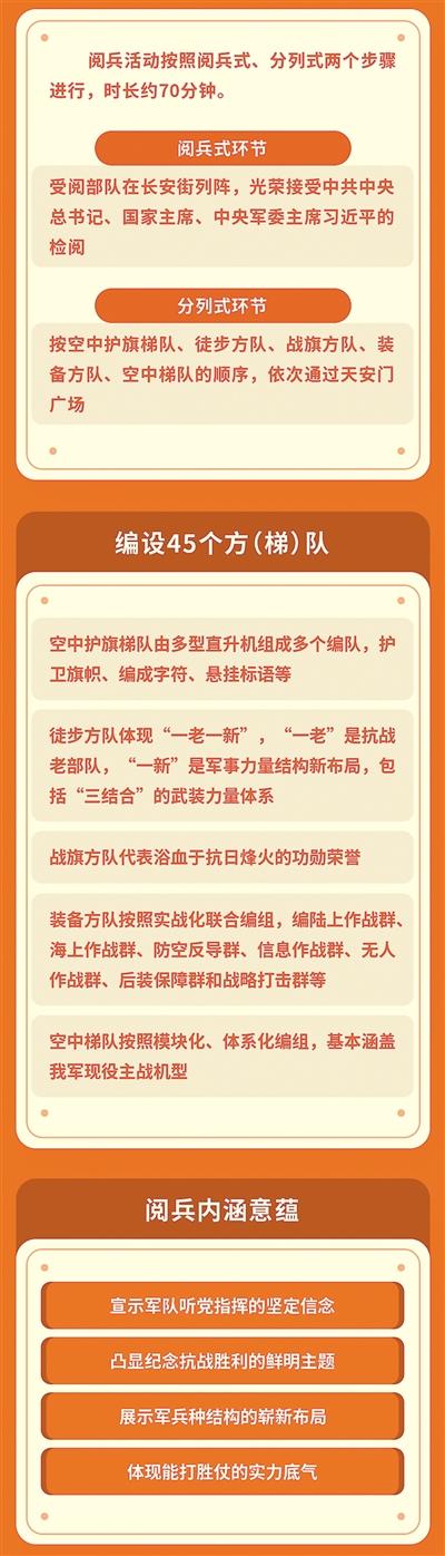 閱兵活動按照閱兵式、分列式兩個步驟進行,時長約70分鐘。閱兵式環(huán)節(jié),受閱部隊在長安街列陣,光榮接受中共中央總書記、國家主席、中央軍委主席習(xí)近平的檢閱。分列式環(huán)節(jié),按空中護旗梯隊、徒步方隊、戰(zhàn)旗方隊、裝備方隊、空中梯隊的順序,依次通過天安門廣場。