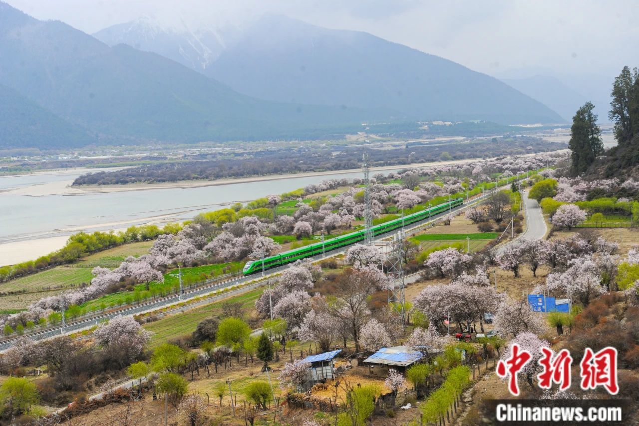 圖為穿梭在桃花林中的拉林鐵路高原復(fù)興號(hào)。 中新社記者 貢嘎來(lái)松 攝
