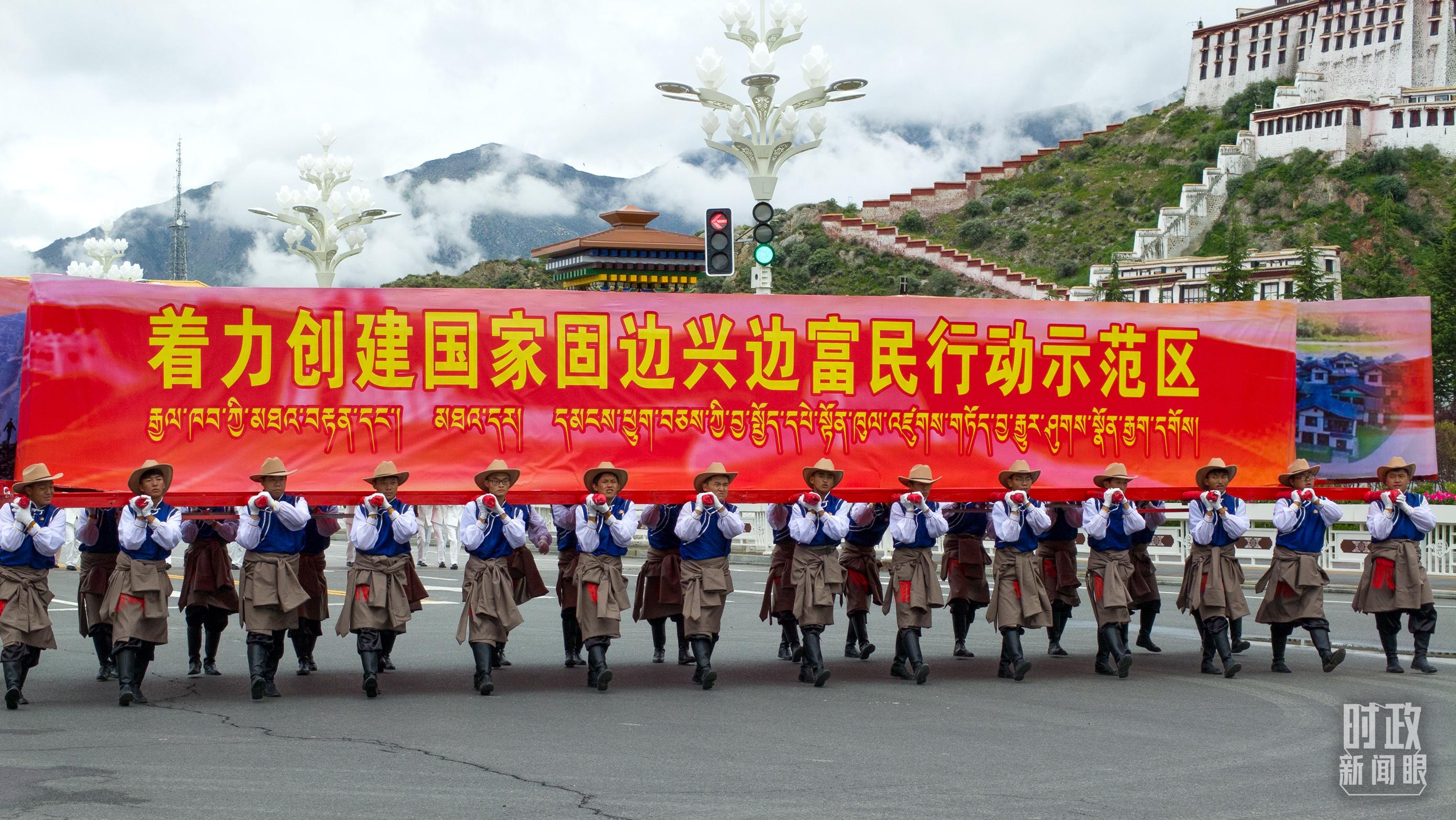 在慶祝大會的群眾游行環(huán)節(jié),“四件大事”單元展示了西藏自治區(qū)“四個創(chuàng)建”的奮斗目標(biāo):著力創(chuàng)建全國民族團(tuán)結(jié)進(jìn)步模范區(qū)、著力創(chuàng)建高原經(jīng)濟(jì)高質(zhì)量發(fā)展先行區(qū)、著力創(chuàng)建國家生態(tài)文明高地、著力創(chuàng)建國家固邊興邊富民行動示范區(qū),分別對應(yīng)穩(wěn)定、發(fā)展、生態(tài)、強(qiáng)邊四件大事。