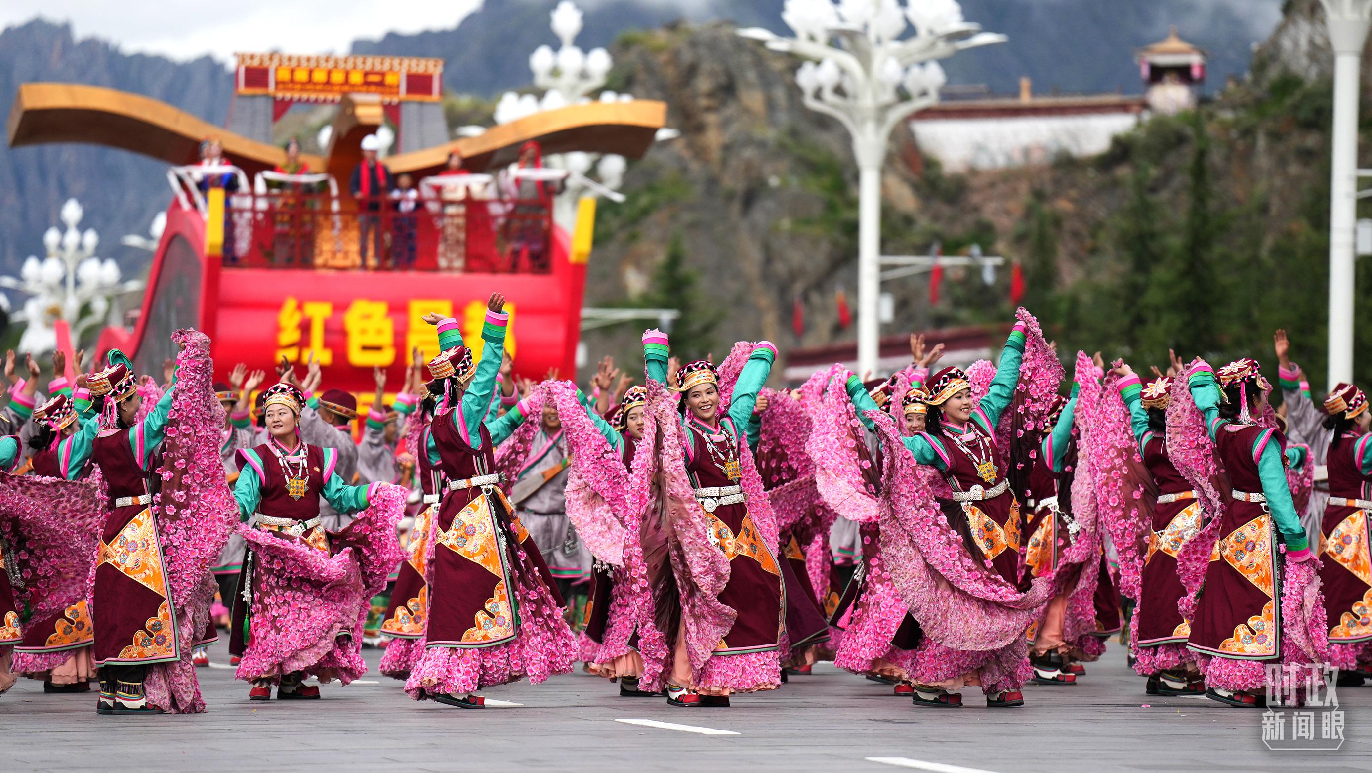 六十載櫛風(fēng)沐雨,一甲子滄海桑田。格桑花海群舞中,悠揚的扎念琴聲響起,雄渾的甲諧舞、瓊結(jié)卓舞、弦子舞、鍋莊舞、普蘭宣舞應(yīng)接不暇,舞出西藏繁榮發(fā)展的精氣神。身穿工布服飾、飛天服飾等藏族特有服飾的游行群眾,以一場非物質(zhì)文化遺產(chǎn)的盛宴向西藏自治區(qū)成立60周年獻(xiàn)禮。