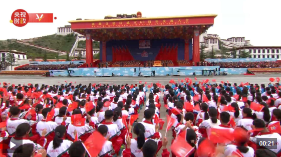 慶祝大會的會場設(shè)置在雄偉的布達(dá)拉宮前,位于群山環(huán)抱之中。大會主席臺采用藏式風(fēng)格。約2萬人歡聚布達(dá)拉宮廣場,紅、黃、白、藍(lán)等體現(xiàn)藏族文化基因的色彩鋪滿眼前,烘托出吉祥喜慶的濃烈氛圍。