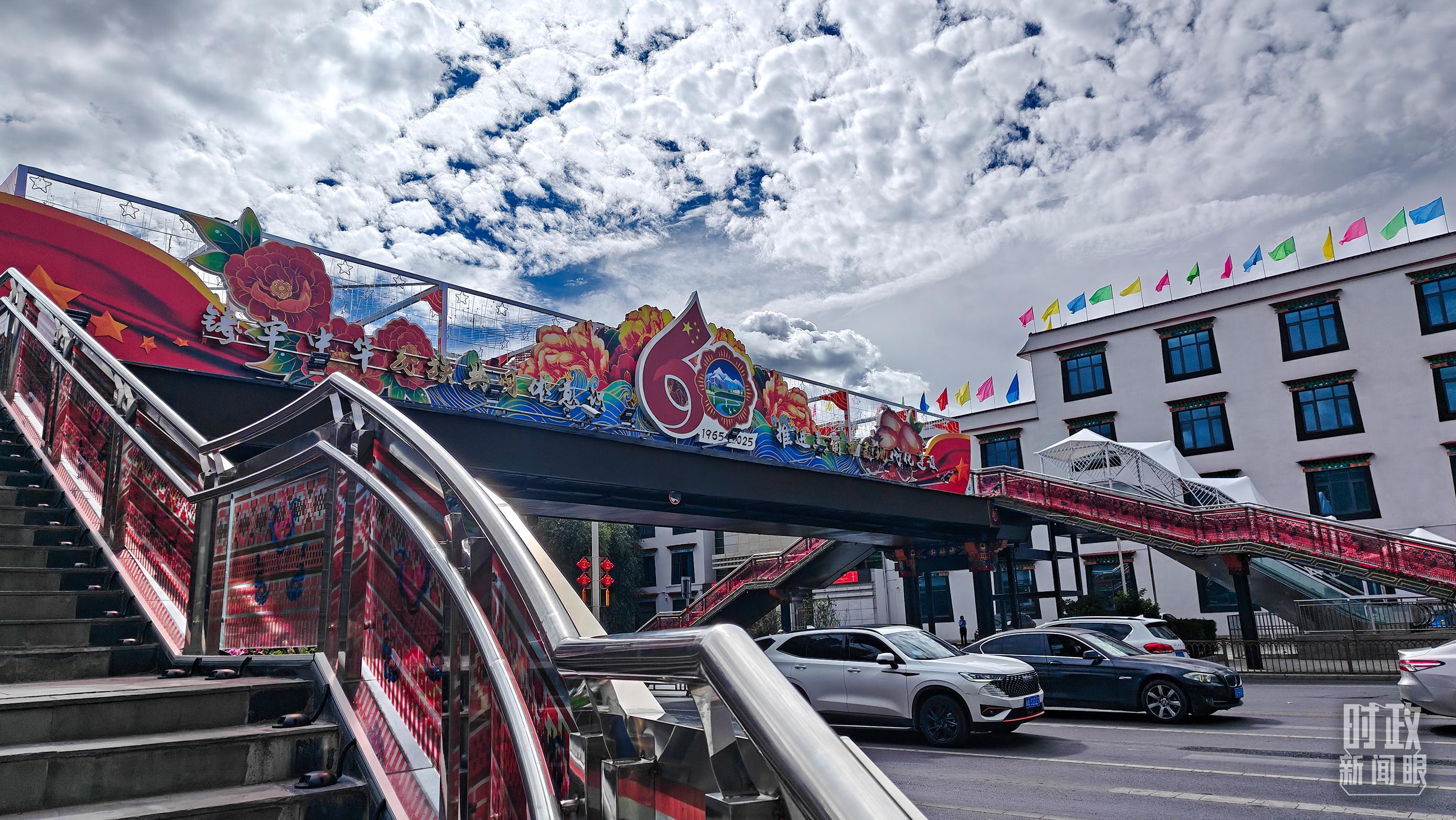 △西藏自治區(qū)成立60周年標(biāo)語牌。(總臺央視記者張宇拍攝)