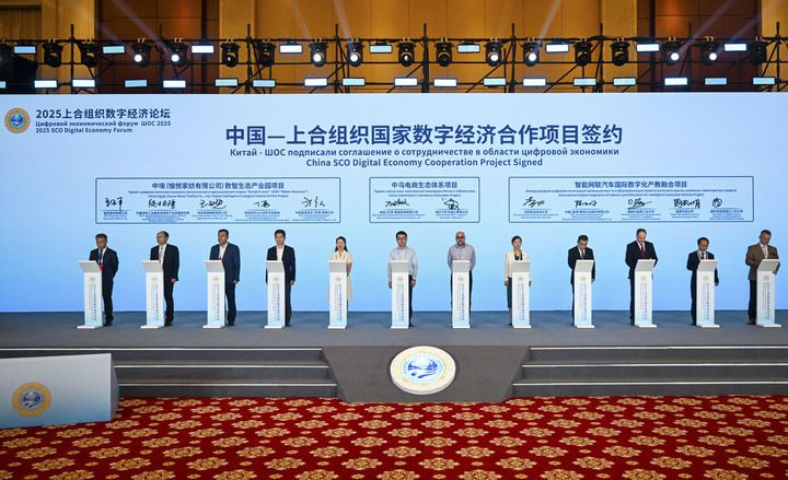 在2025上合組織數(shù)字經(jīng)濟(jì)論壇上,中國—上合組織國家數(shù)字經(jīng)濟(jì)合作項(xiàng)目進(jìn)行簽約(2025年7月11日攝)。新華社記者 趙子碩 攝