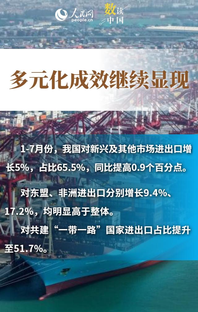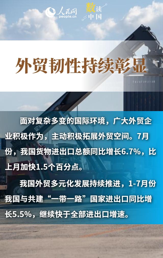 進(jìn)出口規(guī)模創(chuàng)歷史新高、“朋友圈”不斷擴大、民營企業(yè)持續(xù)創(chuàng)新……數(shù)據(jù)顯示,今年前7個月,我國貨物貿(mào)易進(jìn)出口總值25.7萬億元,同比增長3.5%。在外部挑戰(zhàn)之下,我國貨物進(jìn)出口持續(xù)增長,展現(xiàn)出較強韌性和活力,為世界經(jīng)濟復(fù)蘇注入了中國力量。 內(nèi)容來源:國新辦新聞發(fā)布會、商務(wù)部新聞發(fā)布會、人民日報、新華社 圖片來源:新華社 設(shè)計/編輯:郝帥 |