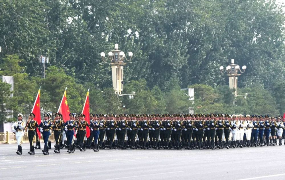 儀仗方隊(duì)護(hù)衛(wèi)黨旗、國旗、軍旗,3日上午第一個(gè)走過天安門廣場,接受祖國和人民檢閱。