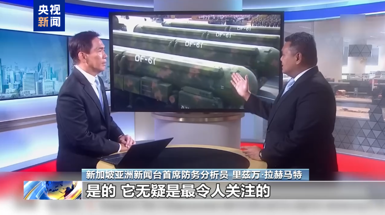 新加坡亞洲新聞臺(tái)首席防務(wù)分析員 里茲萬·拉赫馬特:是的,它無疑是最令人關(guān)注的,因?yàn)樯缃幻襟w上此前彩排的畫面中,它都沒有出現(xiàn)過。我預(yù)計(jì)它的射程要比"東風(fēng)-41"更長(zhǎng)。