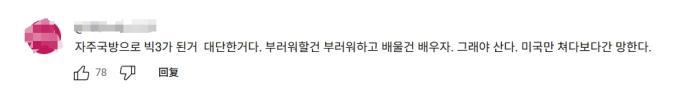 有韓國網(wǎng)友表示,對中國除了羨慕還是羨慕,韓國一定要向中國學習,如果(韓國)只看美國的眼色,就會"亡國"。