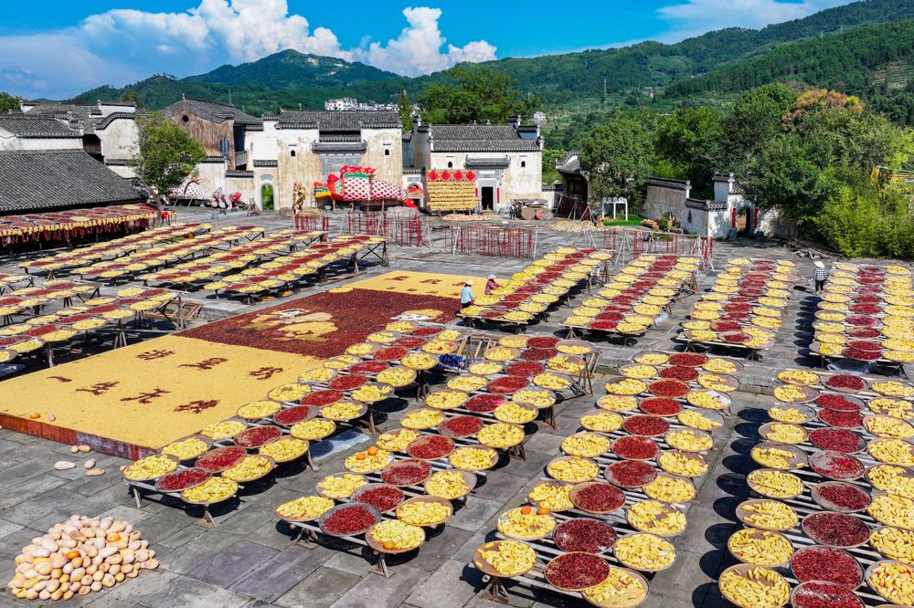 ↑2025年9月17日,農(nóng)民在安徽省黃山市歙縣深渡鎮(zhèn)陽產(chǎn)村晾曬稻谷、玉米、南瓜、紅辣椒等農(nóng)作物。CICPHOTO/施亞磊 攝