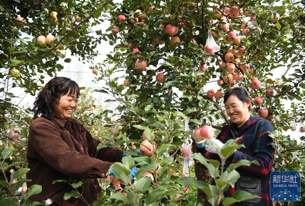 ↑ 10月17日,果農(nóng)在延安市寶塔區(qū)橋溝街道煙洞溝村采收蘋果。新華社記者 張博文 攝