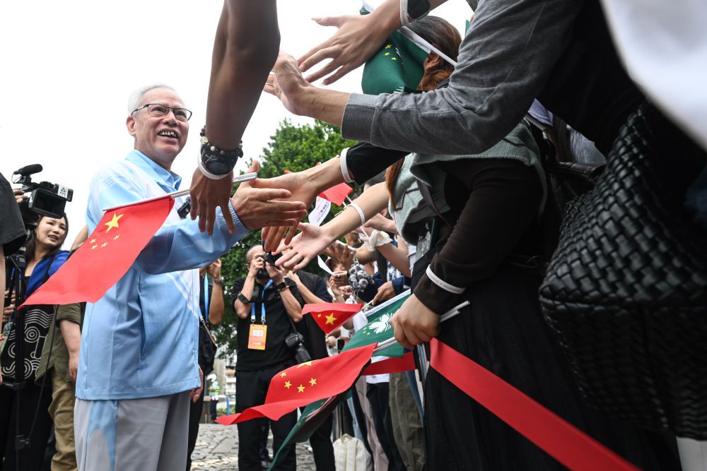 ↑ 澳門(mén)特區(qū)行政長(zhǎng)官岑浩輝(左)在火炬?zhèn)鬟f活動(dòng)中和觀眾握手。新華社記者 那宇奇 攝