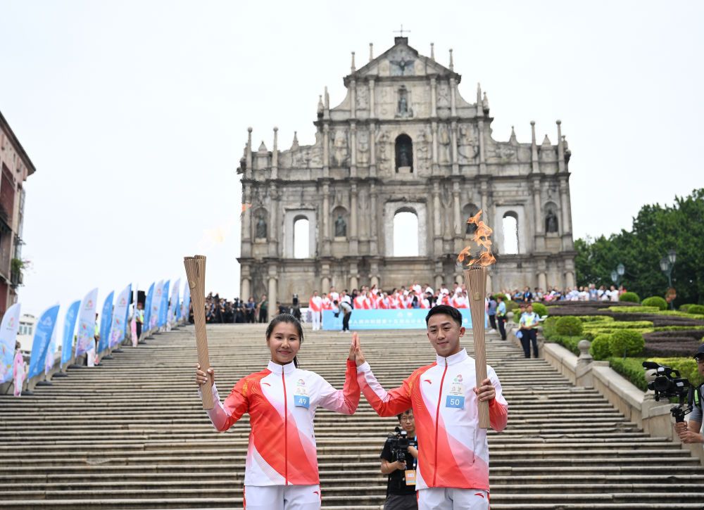 ↑ 火炬手郭建恒(右)、區(qū)海欣在大三巴牌坊前傳遞火炬。新華社發(fā)(張金加攝)