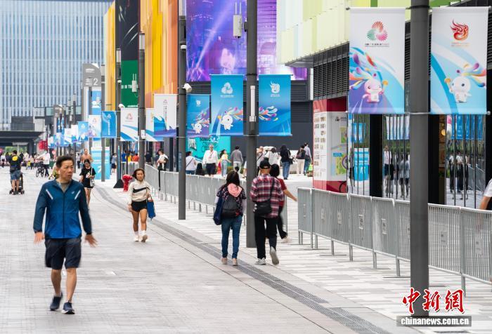 11月1日,香港新晉地標(biāo)啟德體育園的體育大道沿途遍布第十五屆全國運動會(簡稱“十五運會”)裝飾宣傳元素,靜待本屆全運會于11月9日正式開幕。圖為體育大道沿線懸掛將于11月2日舉行的十五運會香港賽區(qū)火炬?zhèn)鬟f活動的裝飾宣傳物料。 中新社記者 侯宇 攝