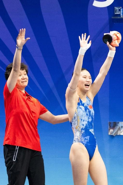 獲得冠軍的上海隊選手陳芋汐(右)和教練在賽后慶祝。(圖片來源:十五運會信息服務中心)