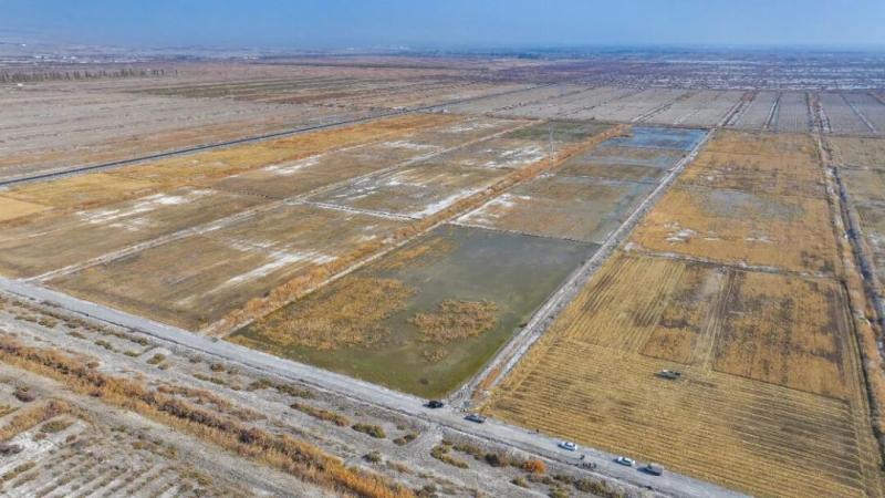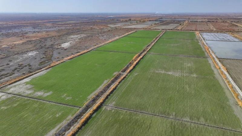 二二三團(tuán)地處天山南坡,土壤表層鹽殼最深可達(dá)40—50厘米,平均厚度20厘米,含鹽量一度高達(dá)千分之二十四。2022年,當(dāng)?shù)嘏c袁隆平青島海水稻研發(fā)團(tuán)隊(duì)合作,啟動(dòng)系統(tǒng)化治理。
