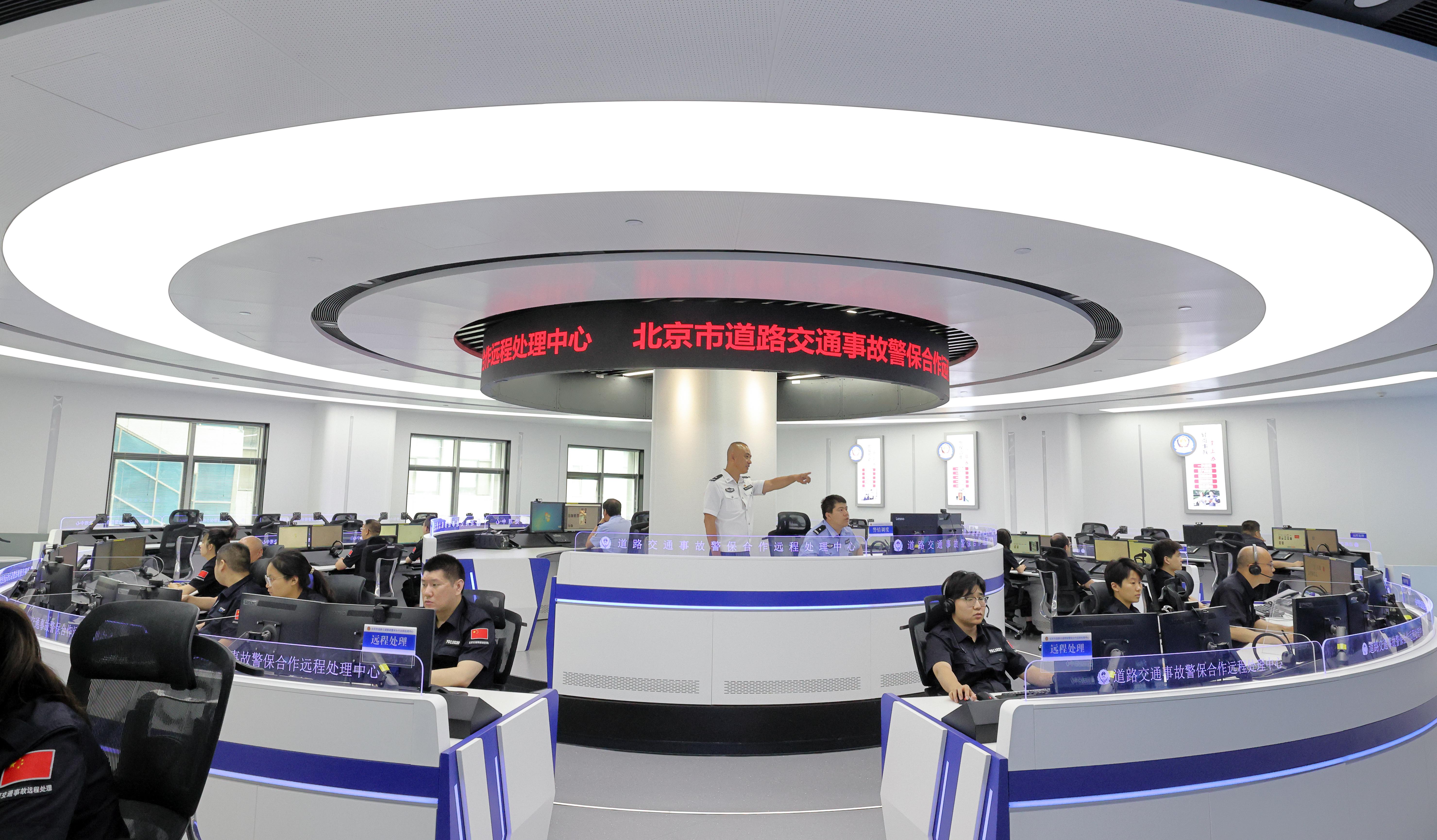 2025年5月23日,在北京市公安局交管局北京道路交通事故警保合作遠程處理中心,事故處理支隊支隊長于海濤(中)和民警在統(tǒng)籌調(diào)度全市輕微交通事故警情遠程處置工作。新華社記者 殷剛 攝