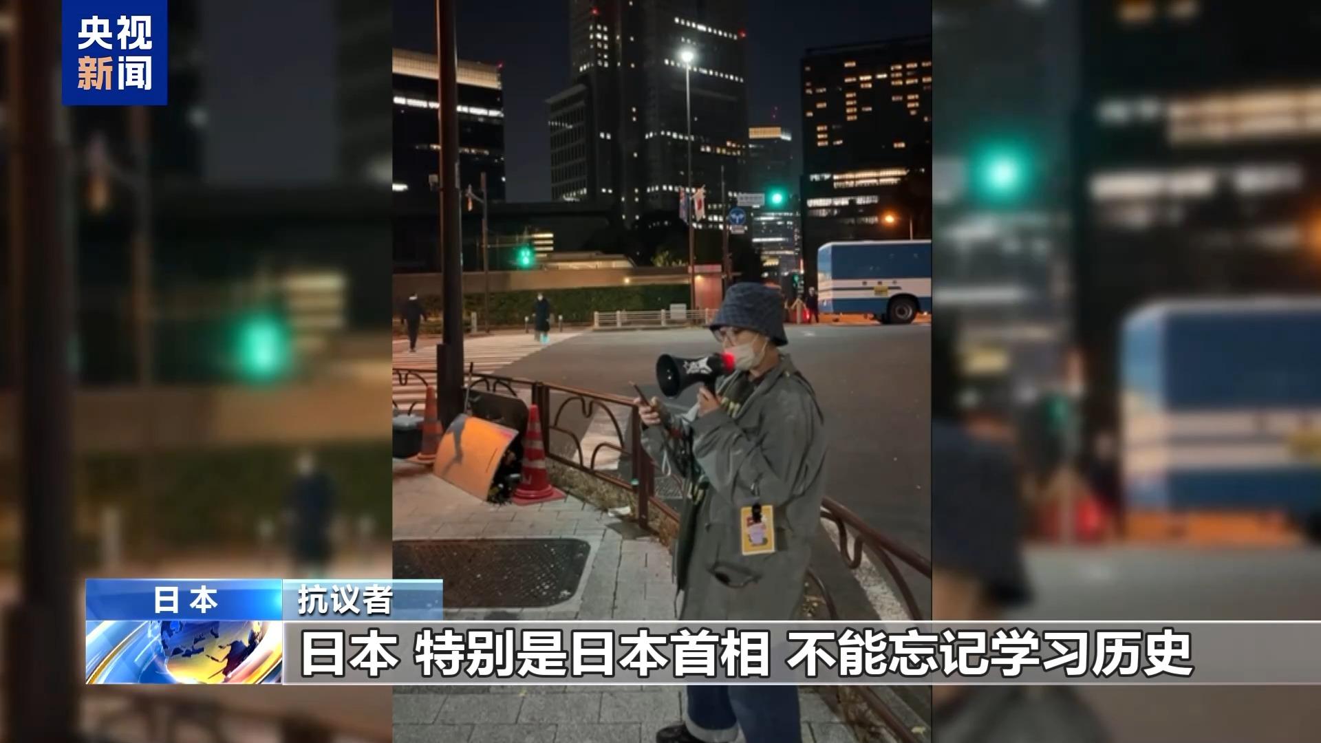 抗議者:歷史上,日本曾以所謂“存亡危機(jī)”為借口 ,對中國發(fā)動了侵略戰(zhàn)爭。日本,特別是日本首相,不能忘記學(xué)習(xí)歷史。日本政府和民間長年積累下來的日中互信和友好關(guān)系,不到一個月就被首相高市破壞,她沒有當(dāng)首相的資格。高市須撤回“臺灣有事”的言論并致歉 ,辭去首相職務(wù)。