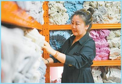 阿拉坦其其格在羊絨店內(nèi)整理貨品。