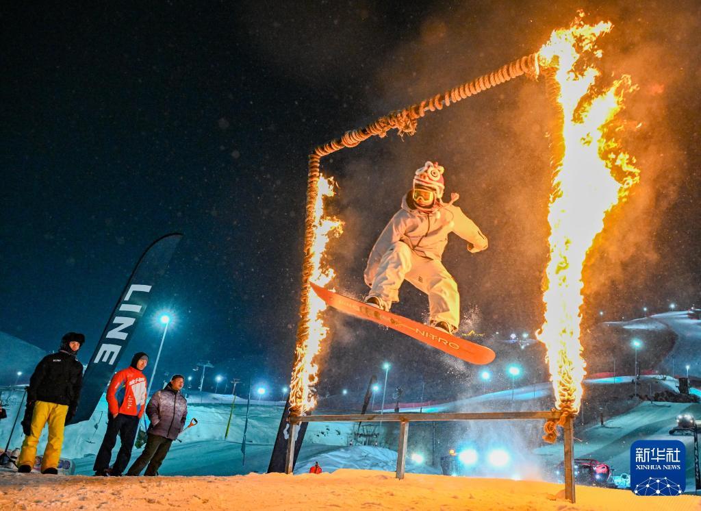 2025年1月29日,在坐落于阿勒泰市城區(qū)的新疆將軍山國(guó)際滑雪度假區(qū),雪友在新春趣味滑雪公園跳臺(tái)活動(dòng)中鉆過(guò)火圈。新華社記者陳朔攝