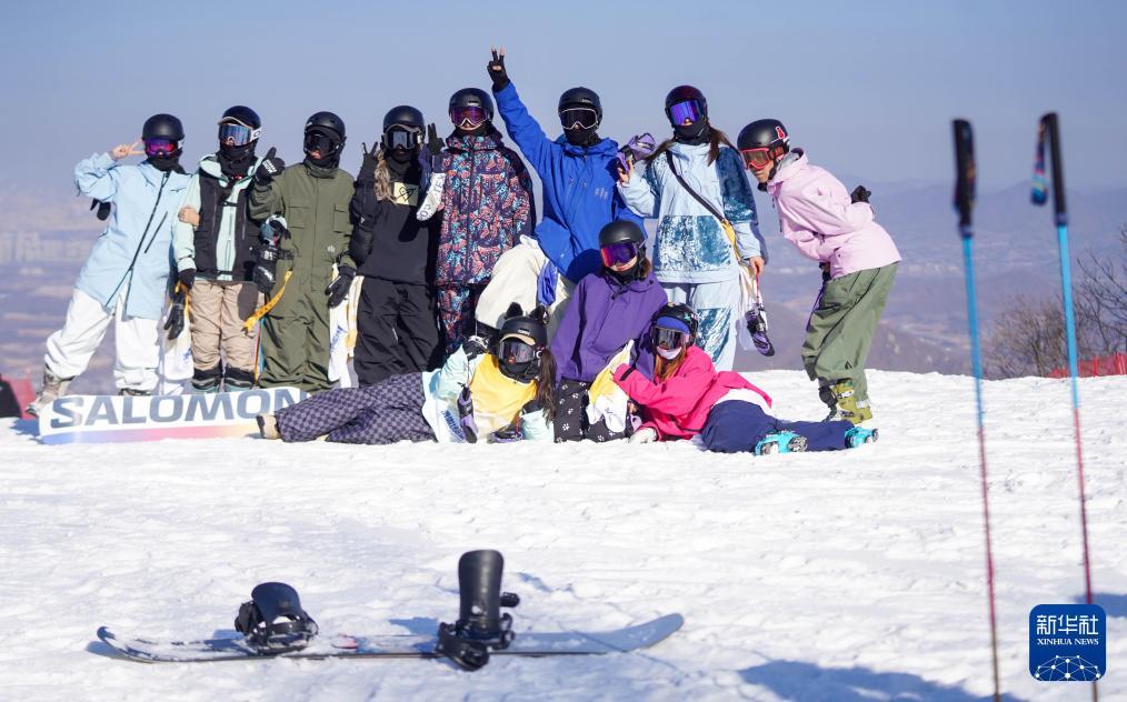 2025年1月27日,幾名滑雪愛(ài)好者在新疆絲綢之路山地度假區(qū)合影留念。新華社記者王菲攝