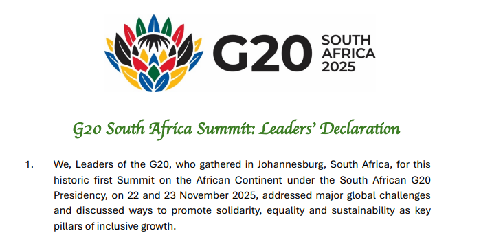 二十國集團(tuán)(G20)領(lǐng)導(dǎo)人第二十次峰會當(dāng)?shù)貢r(shí)間11月22日在南非約翰內(nèi)斯堡開幕。南非國際關(guān)系與合作部長羅納德?拉莫拉在當(dāng)天下午召開的記者發(fā)布會上表示,與會各方已就會議核心議程達(dá)成共識,并通過了《二十國集團(tuán)領(lǐng)導(dǎo)人約翰內(nèi)斯堡峰會宣言》。
