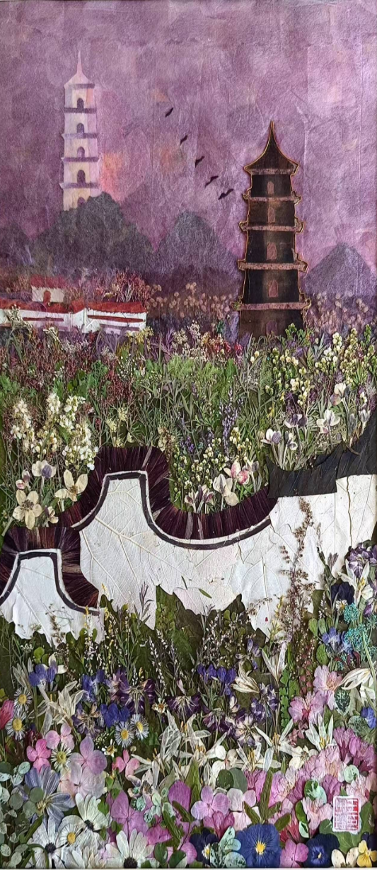 壓花作品 受訪者供圖 壓花也稱為押花,押花為傳統(tǒng)稱謂,壓花為網(wǎng)絡(luò)通用叫法,是一種利用物理和化學(xué)方法將植物材料經(jīng)過脫水、保色、壓制和干燥處理后,制作成裝飾畫、卡片和生活用品的工藝形式,是植物科學(xué)和藝術(shù)的結(jié)合。壓花畫是一種利用花卉、葉片等植物以及其他天然材料拼接、鑲嵌而成的畫作。 據(jù)介紹,2017年,嶺南押花藝術(shù)被列入中國非物質(zhì)文化遺產(chǎn)名錄,押花藝術(shù)宛如一顆的獨特星星散發(fā)著柔和的光芒。中國押花藝術(shù)始于秦漢,形成于唐代,發(fā)展于宋代,在明清至民國具地方特色,在當(dāng)代達到高峰,有悠久的歷史和深厚的文化底蘊?,幰虅?chuàng)作了許多精美的壓花作品,也培養(yǎng)了許多熱愛壓花的學(xué)員,為非遺藝術(shù)的傳承注入新活力。 “邂逅藝術(shù)壓花,吟唱自然之詩?!爆幰瘫硎?,對壓花的鐘情,源于對生活的熱愛。她喜歡自駕游,常驅(qū)車萬里采集植物花卉,采集、挑選、壓制、創(chuàng)作,她感受到壓花時與大自然親密接觸的樂趣,雙手變得越來越靈巧。 瑤姨以對植物壓花的熱愛,繪就了一幅幅動人心弦、沁人心肺、散發(fā)著芬芳的畫卷。她在福州錢塘小學(xué)當(dāng)語文老師那時,便被壓花畫的自然生動之美感染,在學(xué)校帶著學(xué)生開辟壓花制作小空間,成了接待來賓參觀的必到景點。 一幅幅精美的壓花作品,每幅都蘊含著創(chuàng)作者的奇思妙想與細膩情感。其中,四幅大幅的中國風(fēng)花鳥畫格外引人注目:《瑞景》以花瓶中盛放的牡丹和鮮嫩的草莓,展現(xiàn)春日的富貴與甜美;《碧趣》借串串葡萄與靈動鳥兒,描繪夏日的生機與活力;《豐瑞》用紅彤彤的西紅柿和奔跑的小雞,傳遞秋日的豐收與喜悅;《靈芷》以清貢圖風(fēng)格呈現(xiàn)盛開的水仙花和蘭花,展現(xiàn)冬日的高潔與堅韌。 《瑤姨壓花藝術(shù)畫展》不僅是瑤姨壓花藝術(shù)的精彩呈現(xiàn),更是對植物壓花文化的推廣。在梁厝古樸的藝文空間里,傳統(tǒng)壓花技藝與現(xiàn)代布景相互交融,碰撞出獨特的魅力。參觀的市民都被這些精美的作品深深吸引,在一幅幅作品前駐足欣賞、拍照留念,對壓花藝術(shù)也有了更深的認(rèn)識。 瑤姨的壓花藝術(shù)作品以獨特視角、細膩手法和大膽創(chuàng)意,在國際國內(nèi)比賽中屢獲殊榮?!冬幰虊夯ㄋ囆g(shù)畫展》是瑤姨的夢想之一,她正與市民共赴花草的浪漫之約。 |