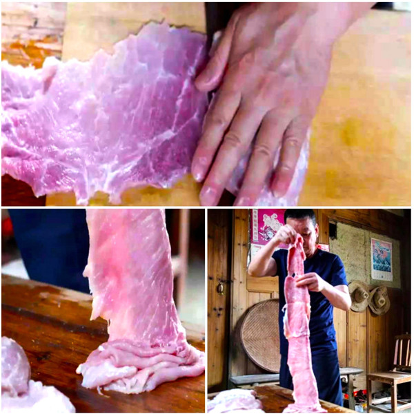 明溪肉脯干制作技藝省級(jí)非遺代表性傳承人羅顯光顯示刀工。 林銘水 攝 2008年,明溪肉脯干制作工藝被評(píng)為福建省省級(jí)非物質(zhì)文化遺產(chǎn)保護(hù)項(xiàng)目。要說(shuō)最知名的明溪肉脯干,當(dāng)屬“榮興”肉脯干,它由羅林希于1939創(chuàng)建,改革開放后,一直由羅林希孫子羅顯光繼承發(fā)展。榮興肉脯干榮獲商務(wù)部中華老字號(hào)認(rèn)定商標(biāo) 、國(guó)家地理標(biāo)志保護(hù)產(chǎn)品等。羅顯光是目前福建省人民政府認(rèn)定的明溪肉脯干制作工藝非遺代表性傳承人。 傳承古法 薄如紙的肉片回味悠長(zhǎng) 這種具有獨(dú)特風(fēng)味的小吃,最重要的就是選材。羅顯光介紹,制作肉脯干的原料選用的都是土生土長(zhǎng)的上等豬腿肉,腿肉上薄薄的脂肪和肉筋都全部剔除?!凹?xì)節(jié)的地方?jīng)]有處理好,烘烤起來(lái)會(huì)滴油,出來(lái)的肉脯干有肉筋,影響口感。”接下來(lái)就是削片,這個(gè)工序,也是制作肉脯干需要傳承的技藝之一。用一尺多長(zhǎng)的鋼刀將后腿肉橫切成一米多長(zhǎng)、兩毫米厚的肉片,肉的紋理清晰可見,用鋒利的剝刀逐層切剝,所剝之肉,其薄如紙。