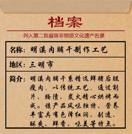 明溪肉脯干:700多年傳承工藝(視頻來(lái)源:明溪縣融媒體中心) 2019年12月底,旅居匈牙利的明溪人黃健忠回國(guó),回家第一件事就約了親朋好友一起喝茶配肉脯干?!俺鰢?guó)在外,就想念這口家鄉(xiāng)味!”吃著肉脯干,聊著家鄉(xiāng)事,此刻的黃健忠覺(jué)得在外所有的辛苦都是值得的。 這種讓黃健忠念念不忘的美食,已經(jīng)流傳了700多年。南宋末年(1277年)文天祥在南劍州募兵后,欲往汀州,路經(jīng)明溪鎮(zhèn)。當(dāng)時(shí),明溪不少百姓參加勤王之師,隊(duì)伍開拔前,親友總要送些禮物給即將遠(yuǎn)行的親人。有人受給老師送“束修”(肉干)的啟發(fā),將豬瘦肉切成薄片,用天然名貴香料腌制,精烤成肉脯干送給親人,以使行伍攜帶,隨時(shí)可食用。此后,明溪肉脯干便聲名遠(yuǎn)揚(yáng),廣為流傳。