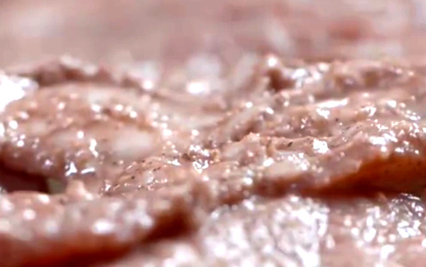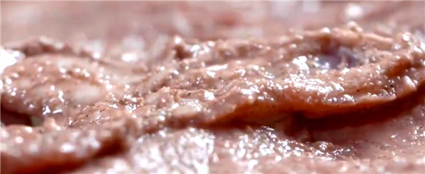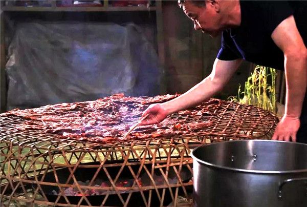 腌漬是決定肉脯干口味的關(guān)鍵環(huán)節(jié)。明溪縣融媒體中心供圖 腌漬是決定肉脯干口味的關(guān)鍵環(huán)節(jié)?!拔覀兪褂玫亩际翘烊恢参锵懔希∠恪④钕?、桂皮、八角等配料先浸泡,浸泡后用石墨研磨成漿?!绷_顯光說(shuō),一層香料、一層肉片,層層疊疊浸漬,最大程度擴(kuò)大食材與香料的接觸面,保證味道均勻,肉質(zhì)鮮美。 “三分做,七分烤”,腌漬好了的肉片講究用木炭文火烤炙。不同區(qū)域的竹籠要鋪上不同厚度的肉片,保證所有的肉片在同一時(shí)間熟度一致。晾著肉片的竹籠下,架起一盆炭火,慢慢地烘烤,不時(shí)地翻動(dòng)一下肉片,四個(gè)多小時(shí)后肉脯干烤熟,羅顯光已是滿頭大汗,幾十年來(lái),羅顯光嚴(yán)格采用客家古老工藝制作肉脯干。