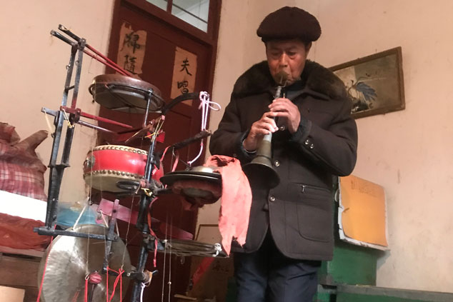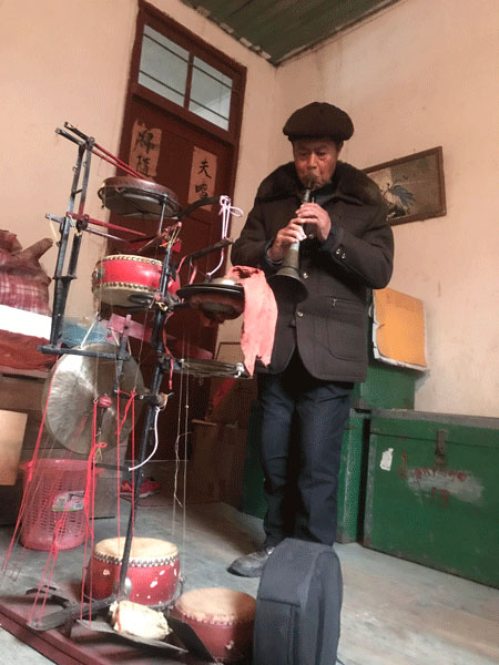 虞東生演示“絕活”。劉建飛攝 “我試著把大鑼、小鑼、大鼓、小鼓、叫鑼、鈸和板等樂(lè)器焊接到一套道具上,自已做‘獨(dú)門(mén)樂(lè)器’。像這樣,一邊用腳踩擊大鑼、小鑼、大鼓、小鼓、叫鑼、鈸和板,一邊用嘴吹笛子或嗩吶?!庇輺|生一邊說(shuō),一邊擺弄著他的“獨(dú)門(mén)樂(lè)器”。 “工具做出來(lái)后,練就 ‘絕活’還得靠自己。剛開(kāi)始練的時(shí)候非常難,不是忘了手就是忘了腳,總是配合不好。但是我堅(jiān)持每天都練,練到腳打抖,抬腳都難。”就這樣足足練了四個(gè)月,虞東生的“絕活”終于練成了。他一人能攬下6個(gè)人的活,同時(shí)演奏8 種樂(lè)器,成了“一心多用”的器樂(lè)手。中央、省、市多家媒體都曾對(duì)他這一絕活進(jìn)行報(bào)道。 虞東生還有另一個(gè) “絕活”——飾演《天官賜?!防锏奶旃佟C慨?dāng)鄉(xiāng)村開(kāi)新臺(tái),這個(gè)節(jié)目是必上的。節(jié)目里只有天官一人主唱,其他十三個(gè)演員圍著天官轉(zhuǎn)。能扮演天官的都是德高望重的老藝人,除現(xiàn)年90歲的老前輩劉明外,村里只有虞東生能演天官?!斑@么多年,只有我會(huì)在開(kāi)新臺(tái)時(shí)表演?!闭f(shuō)到此事,虞老頗為自豪。 潛心譯舊譜 教徒弟傳承文化