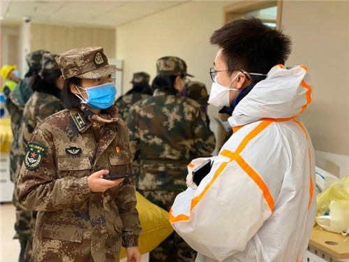 人民日報社政文部記者李龍伊(右)在武漢泰康同濟醫(yī)院采訪部隊援漢人員。 人民日報客戶端專門開設(shè)專題,31個省區(qū)市地方頻道推出大量準(zhǔn)確發(fā)布當(dāng)?shù)匾咔樾畔?,生動展現(xiàn)抗疫感人故事的原創(chuàng)報道。截至2月17日零點,人民網(wǎng)先后推出疫情防控報道及短視頻5萬余篇,總閱讀量超過93.36億次。健康時報發(fā)布相關(guān)報道及視頻2100余條,總閱讀量(含視頻播放量)10.7億。