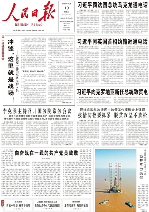 2月19日《人民日報》一版版面 在這場來勢洶洶的疫情面前,前方記者迎難而上,宵衣旰食,用責(zé)任與擔(dān)當(dāng)沖鋒在抗疫采訪第一線,用初心和使命激發(fā)必勝信念。人民日報社湖北分社記者程遠(yuǎn)州是報社最早關(guān)注和報道武漢疫情的記者。2019年12月31日,程遠(yuǎn)州就通過調(diào)查,率先寫出報道《武漢不明原因肺炎不能斷定是SARS 7例病情危重》,文章在人民日報微博發(fā)出后,引起廣泛轉(zhuǎn)載。湖北分社和人民網(wǎng)湖北頻道編輯記者自疫情暴發(fā)以來,全體堅守在一線,寫出大量生動感人的報道。主動請纓赴武漢的山東分社采編中心主任侯琳良,元宵節(jié)這天剛把后方安排的稿件寫好,中午就和湖北分社社長賀廣華從武漢驅(qū)車兩個半小時,到咸寧通城縣雋水鎮(zhèn)采訪基層防控壓實責(zé)任的情況,晚上趕回武漢寫稿。人民網(wǎng)湖北頻道記者郭婷婷接到報道任務(wù),告別才5個月大的女兒,火速趕回武漢,兩天內(nèi)趕寫出19篇報道。