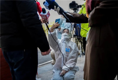 2月17日,人民日報社《健康時報》記者張赫(中)在武漢同濟醫(yī)院中法新城院區(qū)直播腎移植患者出院。 跨部門協(xié)作,專業(yè)化組合,項目制施工。俠客島、學(xué)習(xí)小組團隊放棄休息時間,全體成員共同奮斗,堅持每天發(fā)布最新“戰(zhàn)疫”報道?!敖】?7℃工作室”充分發(fā)揮專業(yè)融媒體工作室優(yōu)勢,讓權(quán)威專家發(fā)聲,用科學(xué)阻擊謠言?!敖鹋_點兵”工作室推出《100個紅手印背后的故事》《若有戰(zhàn),召必至!退役軍人投身戰(zhàn)“疫”一線》等新媒體產(chǎn)品,各大網(wǎng)站紛紛轉(zhuǎn)載。 1月23日,除夕前一天,人民網(wǎng)記者崔東、王欲然從北京飛抵武漢,成為人民網(wǎng)第一批增援武漢的記者?!懊鎸σ咔椋覀儧]有太多的時間去準(zhǔn)備,走正確的路,需要勇氣,更需要智慧,親眼見證和記錄一段歷史是記者的責(zé)任?!边@是崔東在北京首都機場登機前發(fā)布的一條朋友圈信息。在與疫情戰(zhàn)斗的日子中,人民網(wǎng)前方記者每日推出文字版記者日記、視頻版“日記Vlog”。人民視頻從1月24日起先后推出《武漢時間》《人民戰(zhàn)“疫”》特別直播節(jié)目,每天下午16點聯(lián)動全國70多家媒體平臺直播。