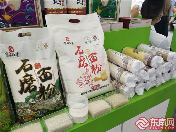 石磨面粉展示 東南網(wǎng)記者張立慶 攝 參展企業(yè)代表湖北金禾糧油副總經(jīng)理祁勇帶來了隨州地理標(biāo)志產(chǎn)品野香優(yōu)、萬香優(yōu)兩種香米以及石磨面粉、掛面。他說,用石磨磨出來的面粉,保留原有的營養(yǎng)成分,口感原始勁道。