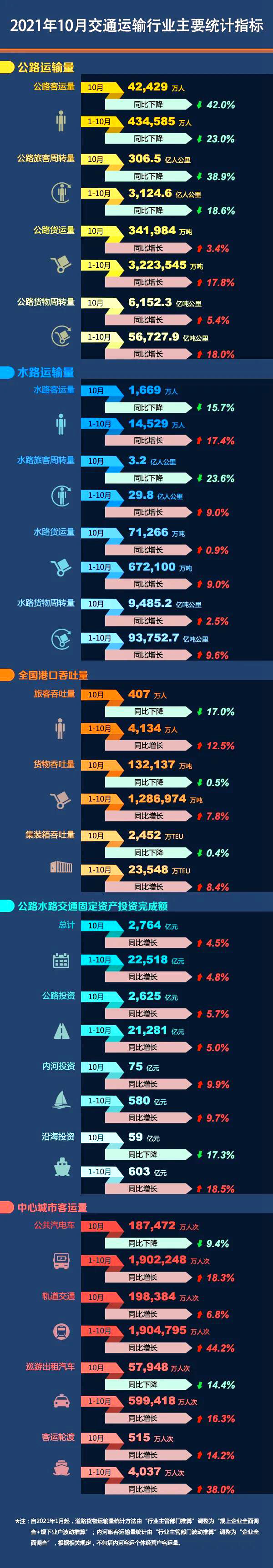 人民網(wǎng)北京11月24日電 (記者王連香)今日,交通運輸部發(fā)布2021年10月交通運輸行業(yè)主要統(tǒng)計指標,數(shù)據(jù)顯示,10月公路客運量42429萬人、水路客運量1669萬人、港口旅客吞吐量407萬人,中心城市軌道交通198384萬人次。此外,1-10月我國公路水路交通固定資產(chǎn)投資達22518億元,同比增長4.8%。